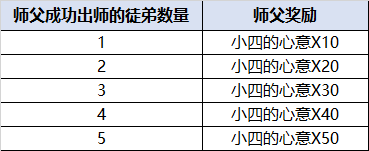 活动期间成功出师的徒弟,可获得:小四的心意X50、创意美发券(不可存仓)X10、经验值的秘药 800%(不可存仓)